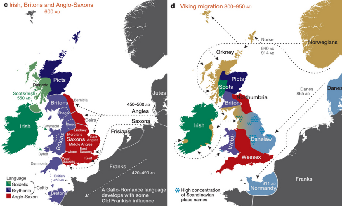 根據歷史記載,不列顛歷經多次移民與外來統治。西元 1 世紀的鐵器時代結束後,羅馬帝國入侵不列顛,控制英格蘭南部;4 世紀後羅馬失勢,盎格魯薩克森人大舉而來;11 世紀時又有諾曼征服;這段期間不列顛的某些地區,則處於維京人的勢力範圍。