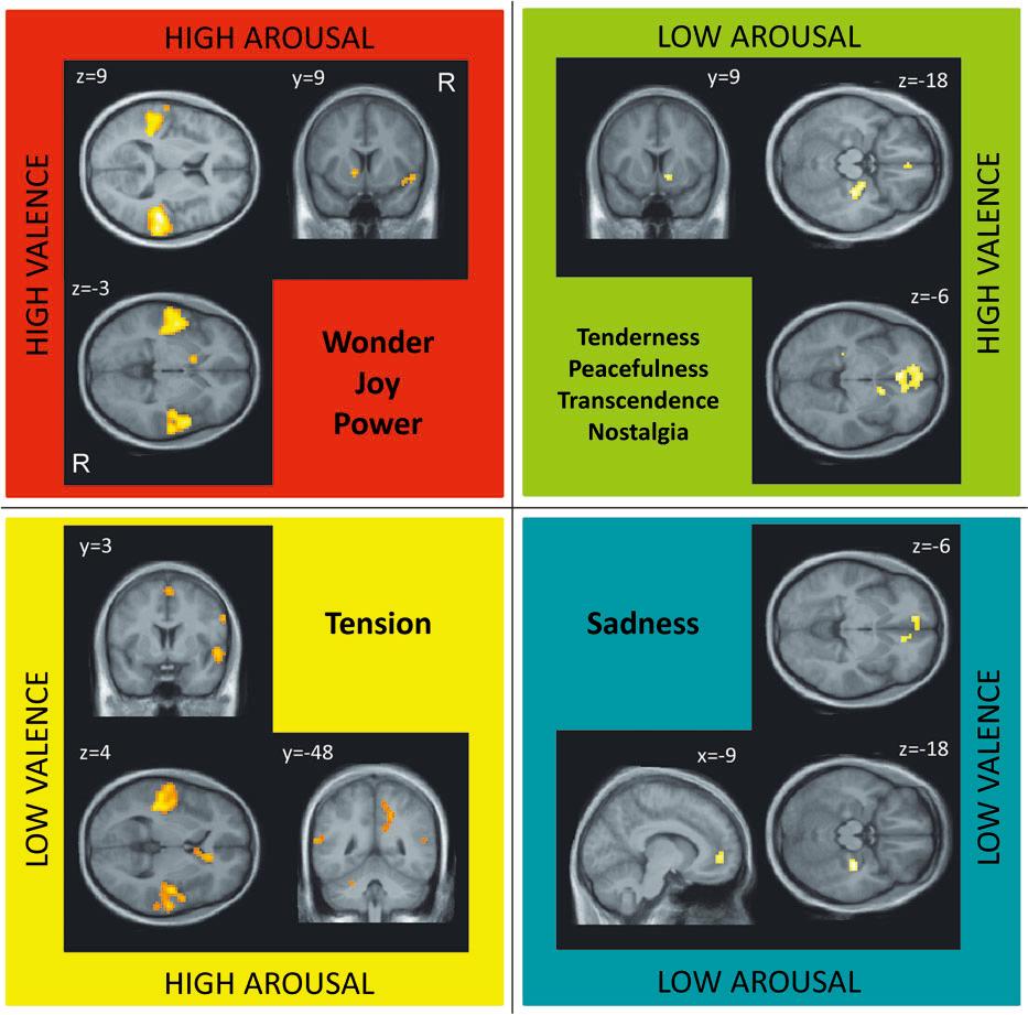 結果顯示,實驗參與者對於音樂的評分和實驗者的認定是一致的(例如實驗者定義為平靜的音樂,實驗參與者在平靜這個項目的評分也是最高的)。除此之外,也可以根據音樂誘發的興奮程度(arousal)及評價(valence)將所有類型分成四類。這四種不同類型的音樂分別會誘發不同腦部區域的活化。簡單來說,正向的音樂會誘發先前研究就已證實與獎賞有關的區域(striatum, insula),但因為興奮程度的不同,會有不一樣的活化型態。再者,只要是高興奮程度的音樂類型都會誘發知覺運動區域的活化;低興奮程度的音樂類型則會誘發與記憶( hippocampus)以及自我(ventral medial prefrontal cortex)有關係的區域。