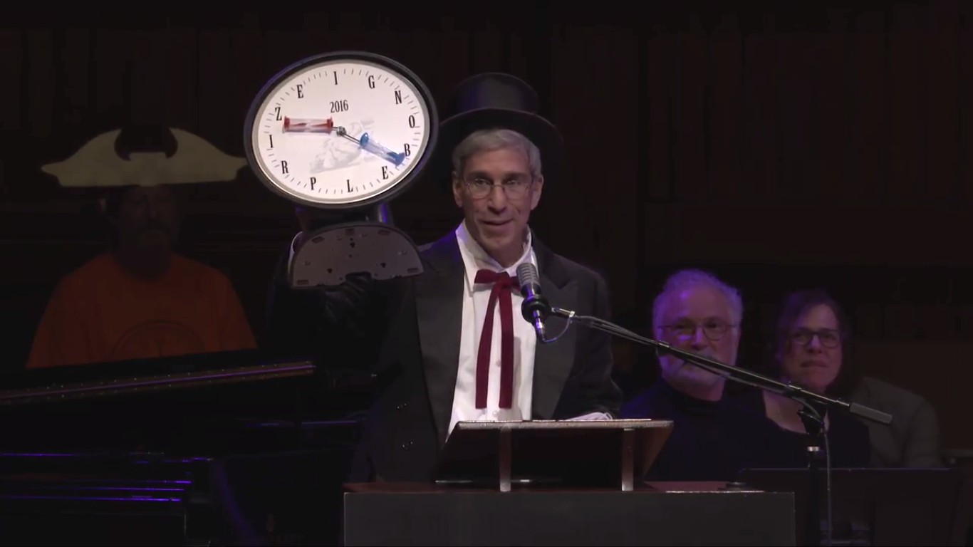 2016 年 26 次第一屆搞笑諾貝爾獎[1]的頒獎典禮(是的,每年都是第一屆!),在台灣時間今天(9/22)清晨六點,於美國哈佛大學的桑德斯劇場(Sanders Theater)舉行。開場一位頭戴有螺旋槳的帽子、脖子上掛著大時鐘的先生象徵著「時間的旋轉(whirligig of time)」,以及活動中的迷你短劇《The Last Second》,都呼應本屆的典禮主題「時間」。