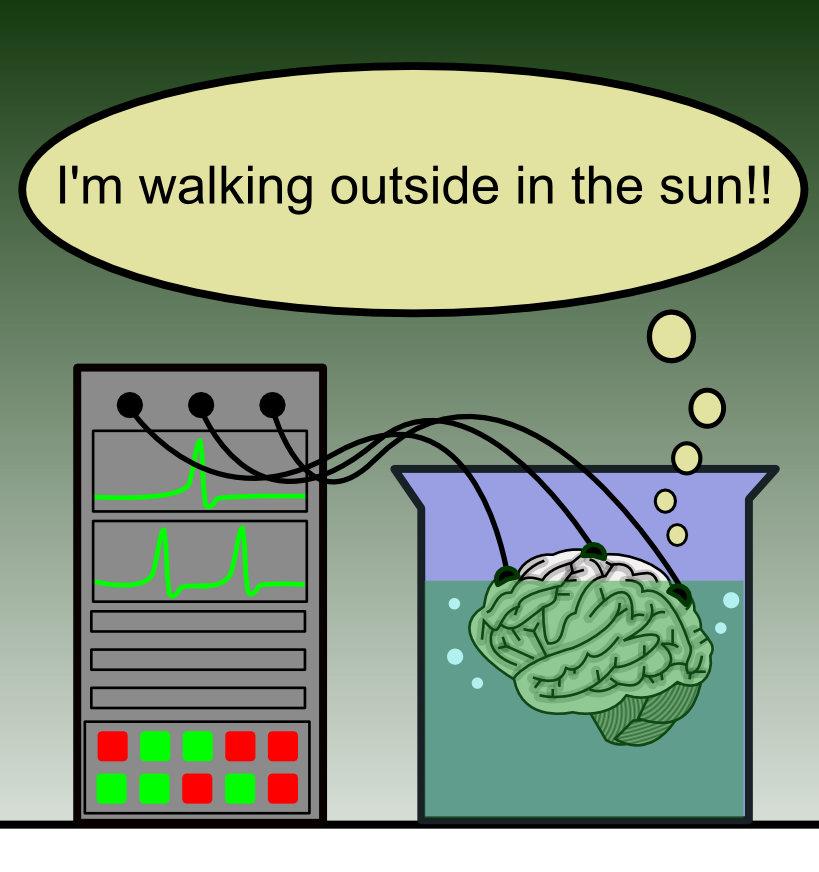 桶中大腦藉由和超級電腦連結,產生出正在陽光下行走的幻覺。圖/By me, user:was a bee - Vector data of the brain is from Image:Central nervous system.svg made by grm_wnr., Public Domain, https://commons.wikimedia.org/w/index.php?curid=1433250