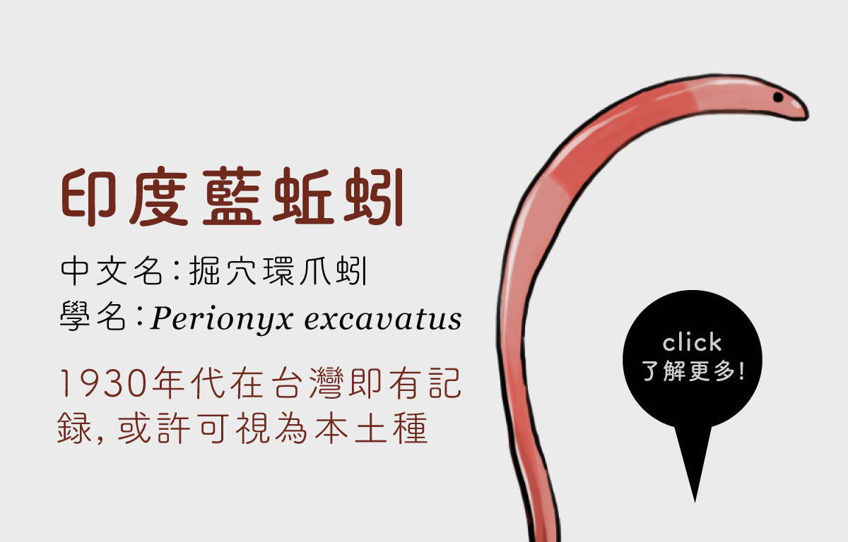 值得一提的是,雖然這種蚯蚓是以印度為稱號,但是牠並不像歐洲紅蚯蚓是1980年前後被人為刻意引進的外來種。早在1930年代,在台的日本蚯蚓學者就已經發表了印度藍蚯蚓的記錄,也就是說,印度藍蚯蚓應該在100年前或更早以前,就被人為從原產地南亞東南亞被帶進台灣,又或者台灣本來也就是印度藍蚯蚓的分佈點之一。總之,既然印度藍蚯蚓已經在台灣耕耘近百年或更久,而且有可能本來就在台灣有分佈,並不一定是人為引入台灣,把牠當作本土種或許也還算合理。