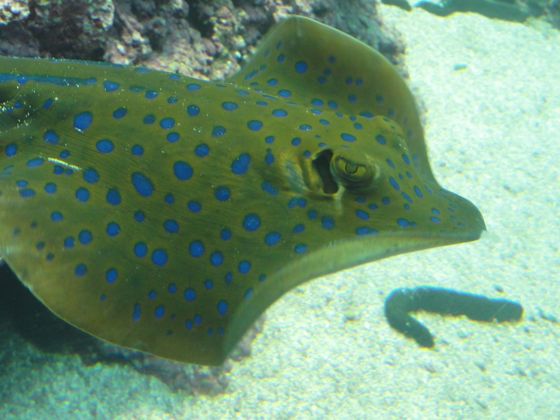 近看藍點緞尾魟的頭部可以發現其呼吸口正前方賊賊的眼睛