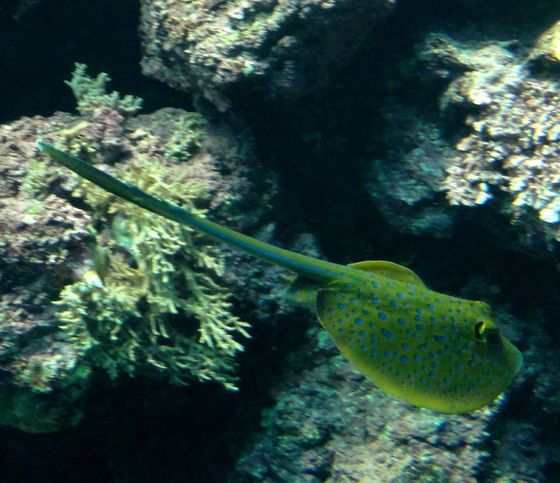 藍點緞尾魟,由於背上散布大小不一圓球狀的藍色斑點,且尾柄兩側有緞帶狀的藍帶,牠的英文名為 Bluespotted ribbontail ray (Taeniura lymma) 。牠廣泛分佈於熱帶海域的潮間帶至水深30公尺深的珊瑚礁區。身體呈卵圓盤狀,最大的體長可達70-90公分,圓盤最寬可達30公分,背部為淡黃褐色,腹部則為亮白色。吻短,有著一雙賊賊的眼睛,大而突出於體表,因它的尾柄具有2根毒刺,每年會更換2-3次,平時毒刺多平貼在尾柄上,只有受到驚嚇時被逼急了才會甩尾進行防禦保護自己。