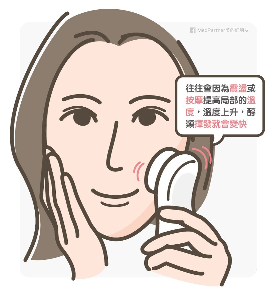 如果是化妝水這類的偏水性保養品,有時會添加高揮發性的醇類物質,就可以快速讓擦過產品的臉感到乾爽甚至清涼。啊,這就是揮發作用啊!不信你拿酒精棉片抹一下手,保證更乾爽更涼……