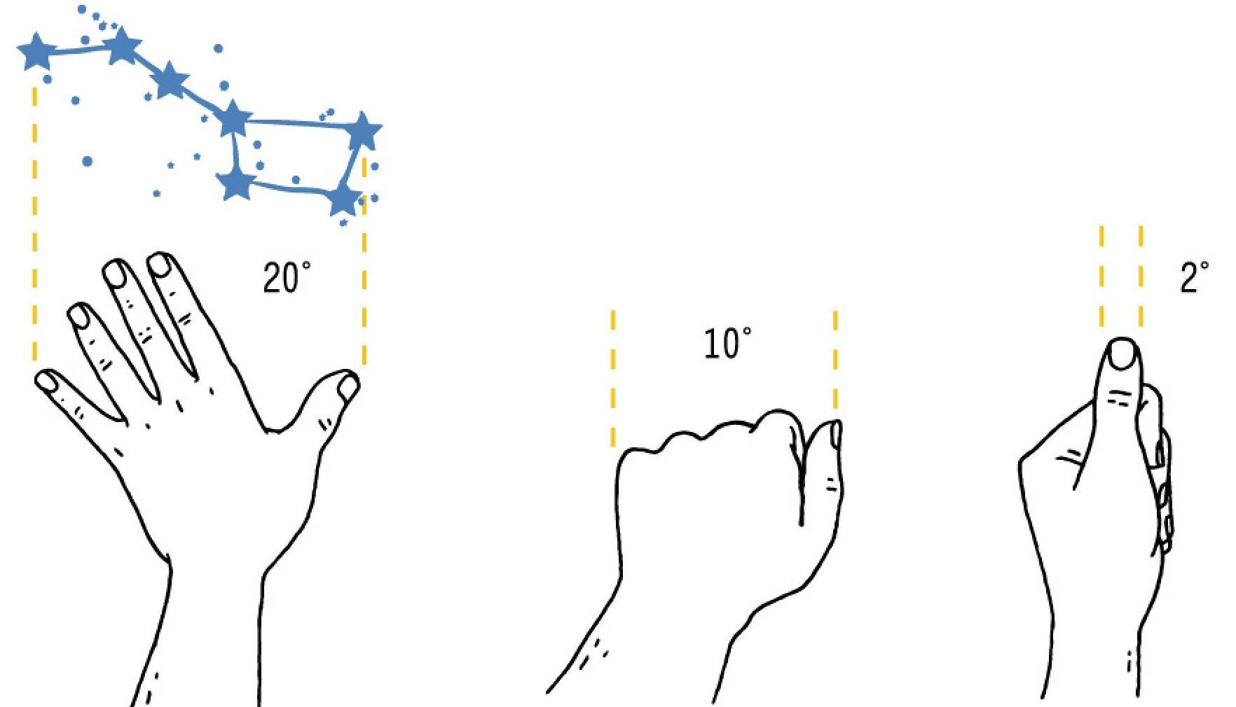 手臂向前直直伸出,手掌張開手心向前,從大拇指尖到小指尖的距離就是 20°,大致也是北斗七星第一顆和最後一顆星的距離。你也可以測量較短的距離。手臂向前直直伸出,手握拳,整個拳頭的寬度就是 10°。你小指頭的寬度就等於 1°,也就是整個月亮的距離,大拇指的寬度則是 2°。你可以不斷練習,等你熟悉這個技巧之後,可以培養自己目測的能力,一看就知道各個恆星或行星之間的距離。