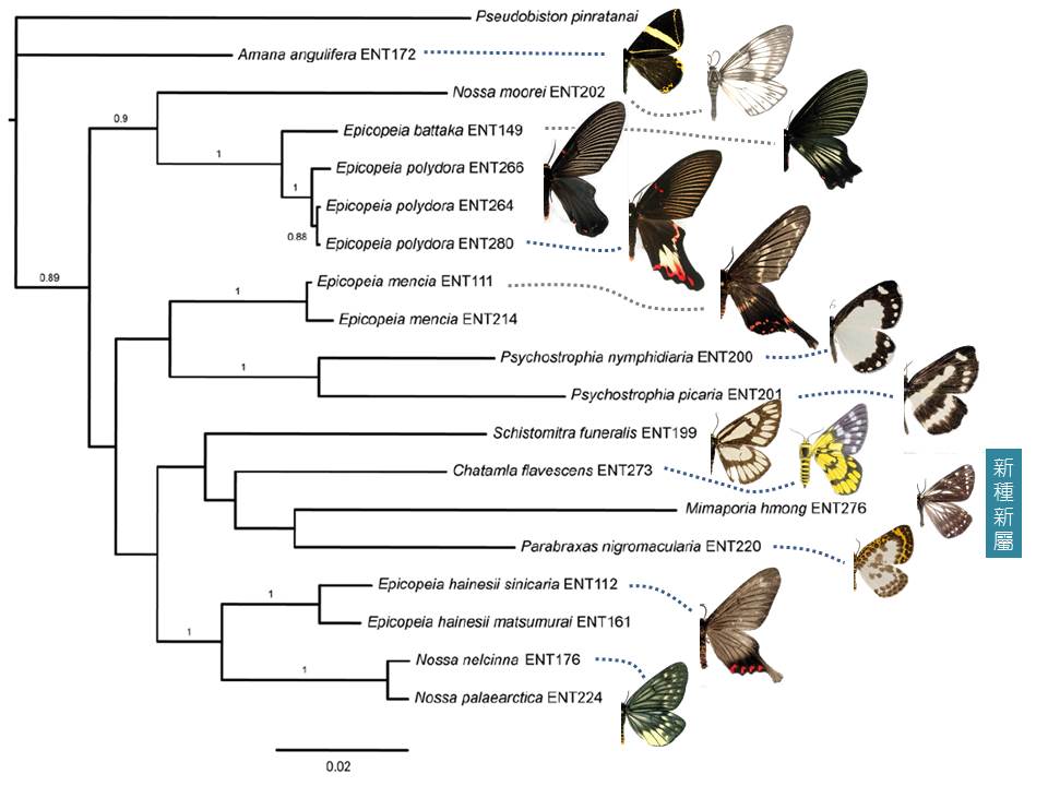 由於鳳蛾如此稀少,因此一般來說學者不會期待,也無法預期還能不能發現這個科的新物種。就在去年底,業餘鱗翅學愛好者張訓誠醫師發現有採集者在越南北部的沙壩採獲一種前所未見的蛾類。當這些標本被送到中山大學生物科學系時,研究團隊便立刻懷疑這是一個從來沒有被發現過的鳳蛾類群。而後使用了 COI、EF-1α 與 28S 的基因片段來重建鳳蛾科的親緣關係後(圖二),發現牠不屬於任何已知的屬,因此決定將牠置於新屬 Mimaporia 且描述為新種 Mimaporia mhong。