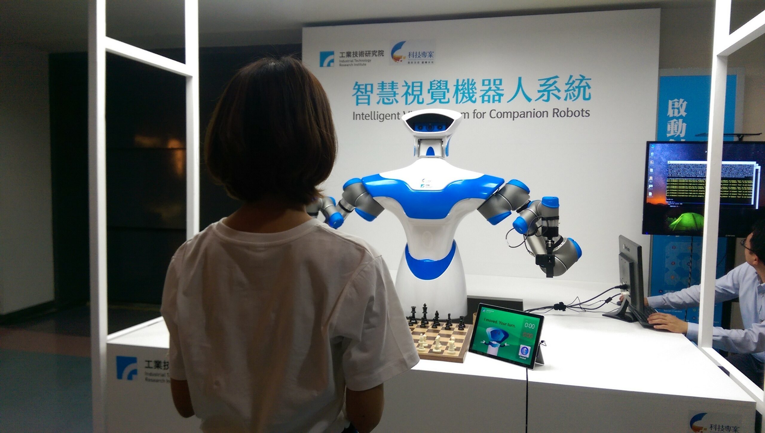 還沒進到展場裡面就會被展場左邊的機器人大大所吸引,這隻機器人不僅會幫你倒咖啡,還可以跟你一起下西洋棋。工研院的智慧視覺系統機器人,用深度視覺感測空間位置,再控制機器手臂倒咖啡和下棋。