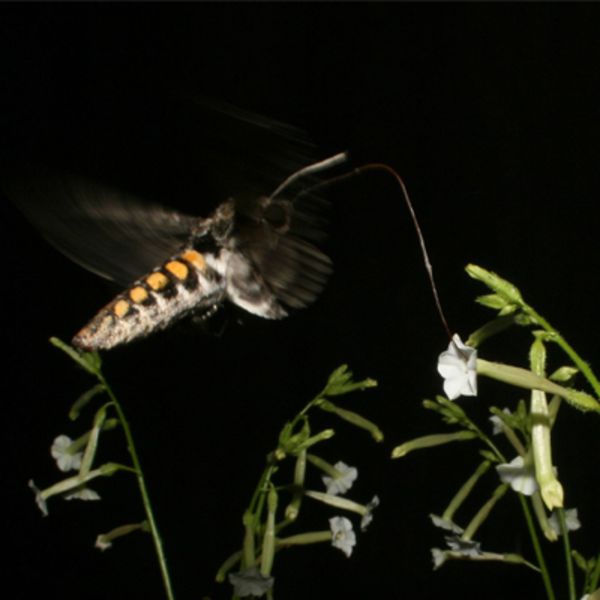 在夜晚期間,菸草天蛾(Manduca sexta)利用其口器從漸狹葉菸草(Nicotiana attenuata)的花吸食花蜜。位於口器尖端的感覺神經元接收到由花分泌的 (E)-α-香檸檬烯 (Bergamotene)刺激後會產生反應。圖/Bergamotene ̶ alluring and lethal for Manduca sexta