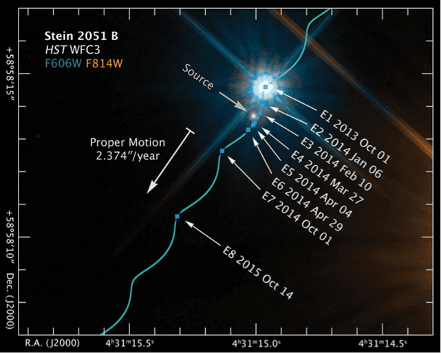 Sahu 團隊對 Stein 2051B 的觀測(此為 Stein 2051B 位於 E1 時的照片)。藍色線表示 Stein 2051B 相對背景恆星(source)的位移。圖/Relativistic deflection of background starlight measures the mass of a nearby white dwarf