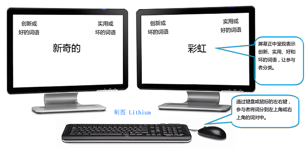 在兩個實驗中,研究者除了直接詢問參與者對於創新和實用的態度,還採用了一種「內隱聯想測驗」的方法,挖掘參與者自己可能也沒有察覺到的潛在想法。參與者要按要求將表示創新(如新奇的、原創的)、實用(如有用的、建設性的)、好(如彩虹、陽光)、壞(如嘔吐、醜陋)的這四種詞分到屏幕上呈現的詞對中。通過比較他們將詞分到「創新/好」、「創新/壞」、「實用/好」、「實用/壞」這四種詞對的反應速度,就可判斷他們對於創新和實用的潛在態度。