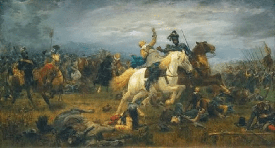 古斯塔夫二世戰死的畫像。勇猛的古斯塔夫二世頗有古代名將的風範,經常率領騎兵親上前線衝鋒作戰,身中多次槍傷。頸部舊傷導致他無法穿上當時仍有一定抗彈能力的板金胸甲,只能身著牛皮輕甲,這也是他最後亡於流彈的原因之一。