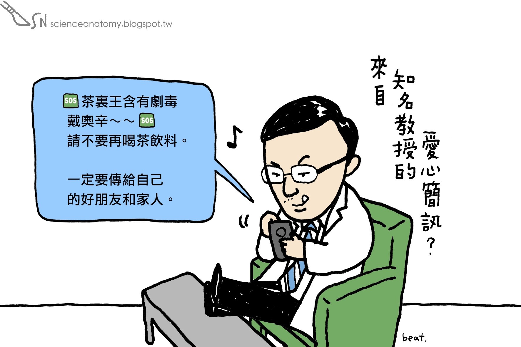點開圖片仔細看看上面的文字,訊息上不僅列出教授姓名、服務單位,也有清楚地描述事件的內容,對於一般民眾來說,具備如此有頭有臉的專業人士背書,這訊息實在太有說服力了。只是簡訊中的張武修教授真的會這樣子說話嗎?尤其最後「一定要傳給好朋友及家人」這樣的用語,與解剖員所認識的醫療專業人士用語大相逕庭。況且如果這麼知名的茶飲料裡面有毒的話,街口便利商店為何還沒有下架呢?案情不單純。