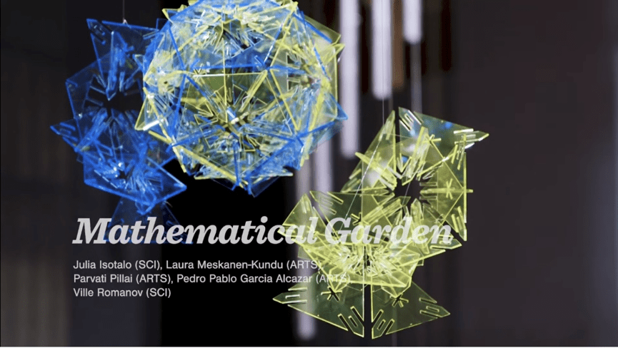 這是間結合三所學校的大學,會出現什麼厲害的課也不意外,不過在數學系出現了一門課名為「鏡廳中的水晶花,當數學遇上藝術與建築」(Crystal Flowers in Halls of Mirrors: Mathematics meets Art and Architecture)還是讓人驚呼了起來,課程名稱不僅有創意,同時還宣告混搭了數學、藝術和建築,完全是門跨領域的課程。幕後的功臣是阿爾托大學數學系講師 Kirsi Peltonen,她和其他教師可是花了整整兩年的時間籌備,從 2013 開始每兩年開設這門課,以水晶花做為象徵,把數學的美分享給更多人,《感官數學》便是這門課的學生創作成果展。