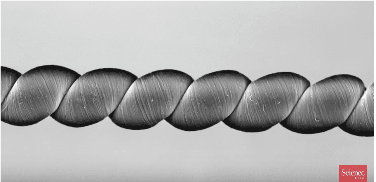 實驗中的螺旋龍從本來繃緊的狀態到完全鬆開,其中產生的能量足以使一顆LED燈亮起。圖/Shi Hyeong Ki@ Science (上圖) & Science Magazine@ Youtube (下圖) 這個紗線由德克薩斯州大學達拉斯分校與南韓漢陽大學共同研發,研究發表在今年8月號的《Science》。實驗過程中使用的是直徑比頭髮還要小一萬倍以上的奈米碳管,他們把奈米碳管薄片放置到轉動的馬達上,就像紡紗般,使薄片變為線,接著再強力扭轉線,把線捲得跟家用電話線很像,也就是螺旋龍。接著,研究人員將螺旋龍放在電解液(實驗中用鹽酸)裡,就成了「螺旋集電器」(暫譯,原文為 twistron harvesters)。當原本緊繃的螺旋龍鬆開時,內部的壓力與摩擦力使奈米碳管釋放電荷,並通過電解液抵達電極,就可以成功發電了!