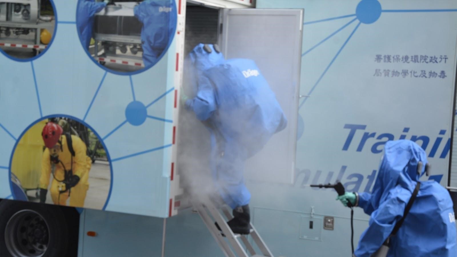 圖/技術小組示範穿著 A 級防護衣、手持偵檢儀器,進入仿真模組訓練車中。
