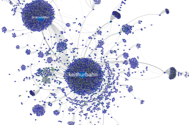 每個上色的圓圈或是節點,代表著曾轉發原始訊息(或曾發布類似訊息)並提及作者Twitter帳號的Twitter使用者。而顏色漸層則代表其他人加入對話的時間,例如較藍的圓圈代表在短短幾分鐘內就回覆Urbahn訊息的人。