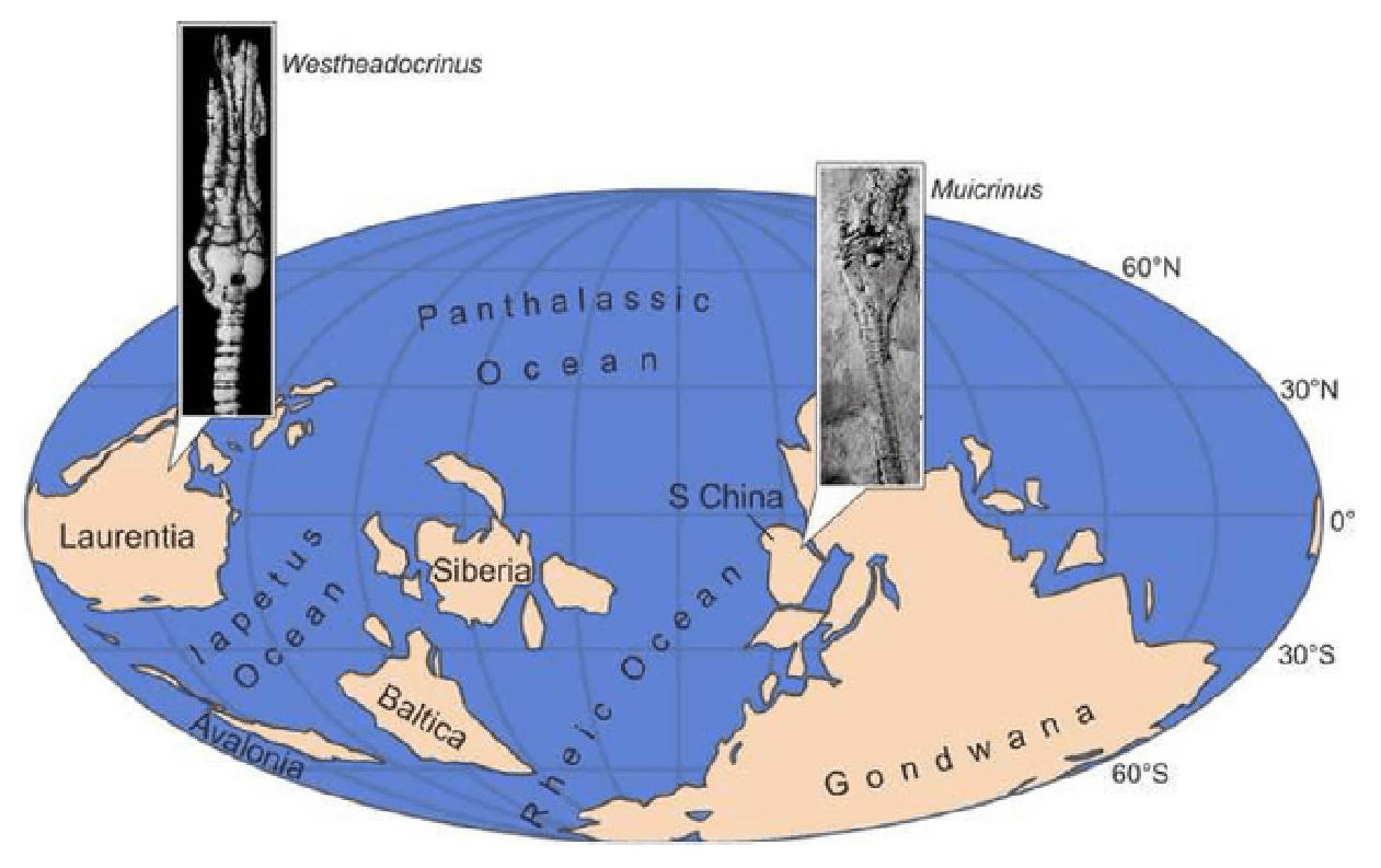 分布於華南陸塊中奧陶世(約大坪期)的穆氏海百合和勞倫大陸產的韋斯特德海百合親緣關係最為接近,意味著「華南陸塊──勞倫大陸」生物地理連結並且支持羅迪尼亞大陸的「失落環節」(missing link)假說。 圖/