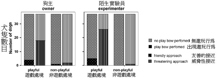 在遊戲處境中,狗對主人和陌生人的反應並無顯著差異。在面對威脅時,跟面對友善接近相比,狗較多進行邀玩行為和發出聲音,並較少出現眼神迴避;走開及護物行為則無顯著差異。
