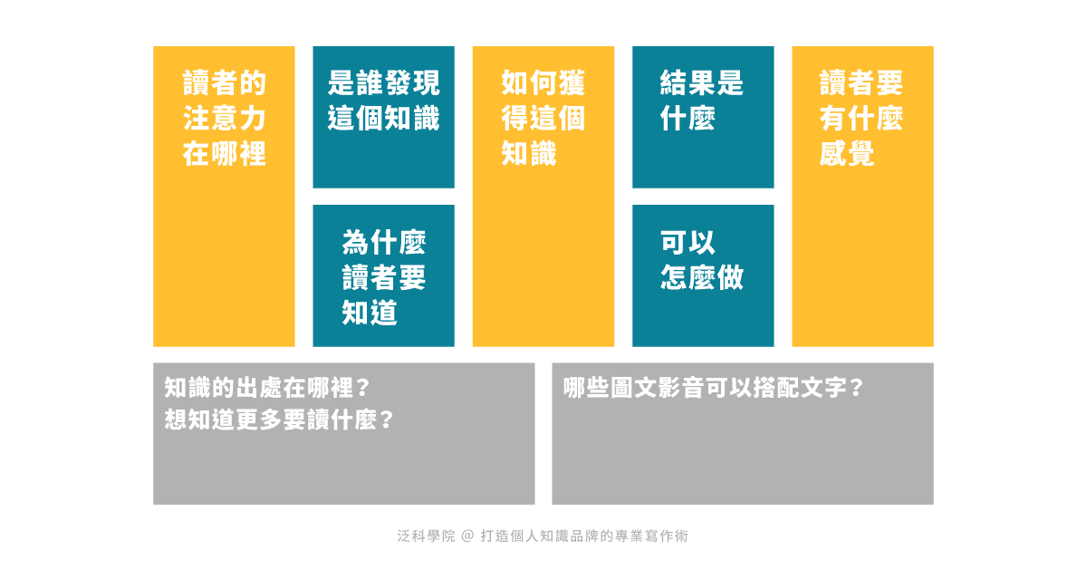 接下來兩個部分,在學測時用不著,但如果是知識寫作者,想讓文章效果更好、讓讀者更信任你,則千萬別漏寫,這兩個部分是「知識的出處在哪裡?想知道更多要讀什麼?」以及「哪些圖文影音可以搭配文字,讓讀者讀起來更舒適、更深刻?」
