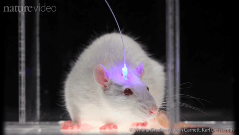 最後 3:45 是一張很有名的圖,講神經科學家如何利用這種方法研究大腦,在老鼠自由活動的情況下。他們把光纖 (傳導光訊號) 和量測的電極做成一個小小的可以上下移動的裝置,將之置入老鼠的大腦上,觀察老鼠在不同行為的時候不同神經細胞的活性變化,並觀察改變不同神經的活性對老鼠行為的影響。