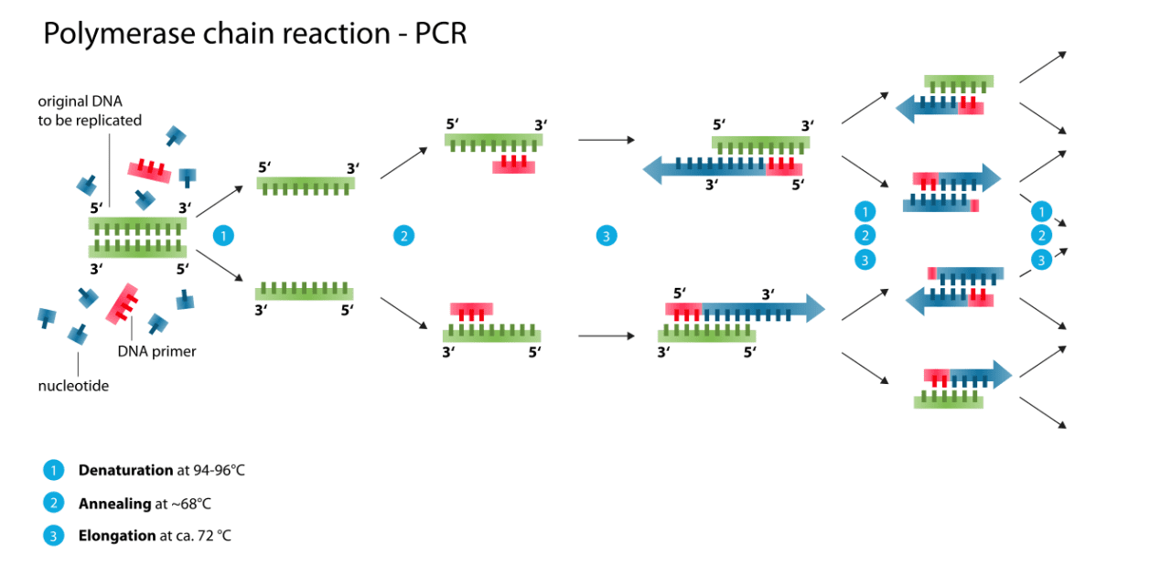 車燈照著漆黑的路面,身旁的女友已熟睡,穆利斯的腦袋繼續想著這個問題。突然一個絕妙的想法逐漸成形:DNA 交纏的雙股在高溫下會分開,稍微降溫後加入事先準備好的「引子」;引子是短短的單股 DNA,其序列恰與目標片段的首尾兩端互補,所以會黏結到這兩個位置,就像用括號把句子前後括弧起來。於是我們有了兩個單股的 DNA 模板,此時再放進 DNA 聚合酶,使 DNA 材料結合到模板上,結果就形成兩個與目標片段一模一樣的 DNA。如此繼續如法炮製下去,所要的 DNA 就會 2、4、8、16、⋯⋯不斷地倍增,兩小時之內就可以得到上億個 DNA!