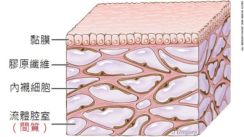 那麼間質(間隙組織)是什麼?其實單單從字面就可以看出,它目前還僅在組織層面,離器官差著一個等級。間質的「廬山真面目」其實就是若干結締組織、膠原蛋白和內襯細胞組成的網狀微型液體腔(中學生物書裡寫的組織液還記得吧?間質其實就是容納組織液的地方)。把這樣一個非典型的簡單構造稱作器官,實在牽強。