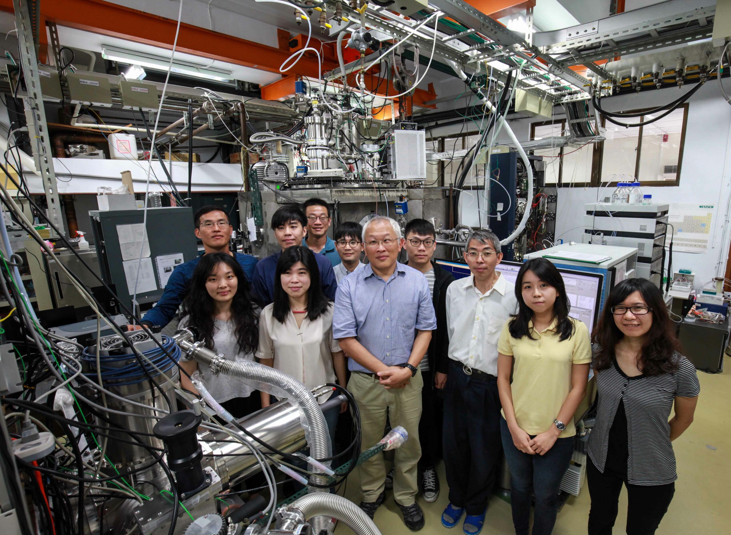 倪其焜與研究團隊成員。後方儀器,為前院長李遠哲於柏克萊大學時自製的交叉分子束儀器,現位於中研院原分所內供研究使用。 攝影│廖英凱