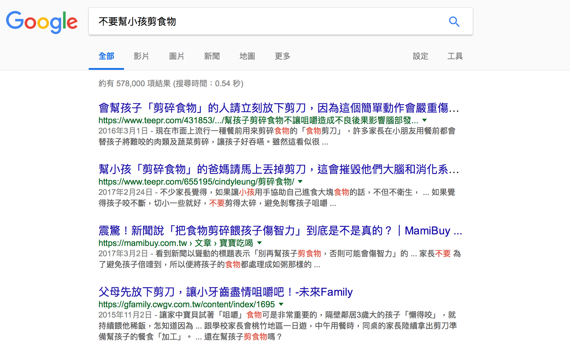 不過最近聽到一則謠言是關於該不該幫小孩剪食物的討論;這些文章所寫的內容都很類似(實在不想放連結,google出來前面幾則都是類似內容農場的網站),簡單說就是不要幫在學吃飯的小小孩剪食物,如果剪食物的話很可能會阻礙小孩「咀嚼」功能的發展,甚至還會傷害智力。謠言還越傳越誇張,該則消息又被加油添醋一番,好似你剪了食物,就會立馬讓小孩的智力降低。