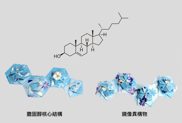 但若膽固醇的結構摺反了,看起來就像是鏡子的反射,這樣就出現「鏡像」的問題。洪上程拿出兩枚摺紙作品對照,這種鏡像的產物,在有機化學領域稱為鏡像異構物(Enantiomer) 。