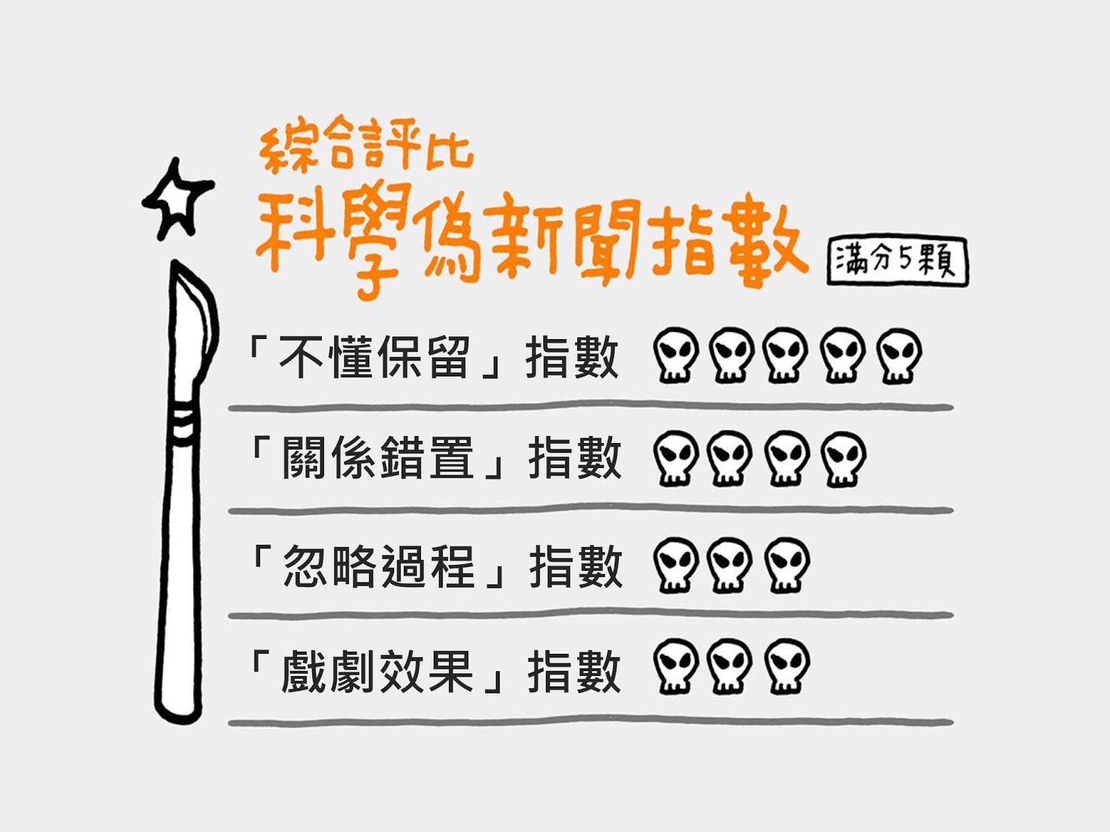當一則訊息中的真假交錯,包含科學研究或專業人士背書,又夾雜訊息產製者的個人推論與浮誇裝飾,對於非此專業領域的人而言,什麼是對、什麼是錯變得難以辨別。或許簡訊製造者只是出自一片想幫助大家,讓每個人都活得健健康康的善心,但若是不小心錯誤傳達了專家的建議,就可能弄巧成拙,不但無法反應原意,甚至讓自己變成一隻披著「專家」皮的狼,成為製造謠言的幫兇。關於這種類型的「專家背書事件簿」,本解剖室給予以下的評價(15 顆骷髏頭):