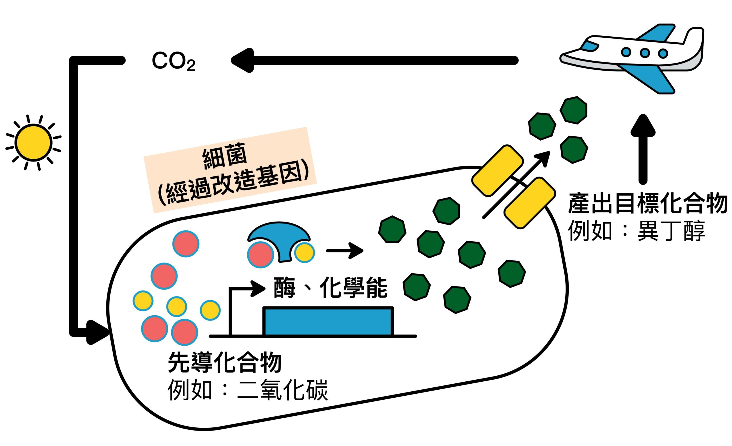 廖俊智與研究團隊,計畫讓細菌細胞進行的合成反應途徑:以二氧化碳為碳源 → 產生燃料 → 達成新的碳循環。 資料來源│廖俊智說明 圖說設計│林婷嫻、張語辰
