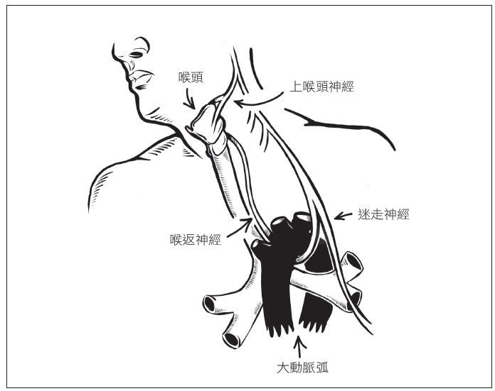 錯了。喉返神經的軸突包覆在一條更出名的神經—迷走神經(vagus nerve)之內。迷走神經自脊髓往下抵達上胸部,自此喉返神經才從迷走神經中分支出來,從肩胛骨稍下處離開脊髓,接著, 左喉返神經繞經大動脈下方,然後再重新回到頸部,抵達喉頭。
