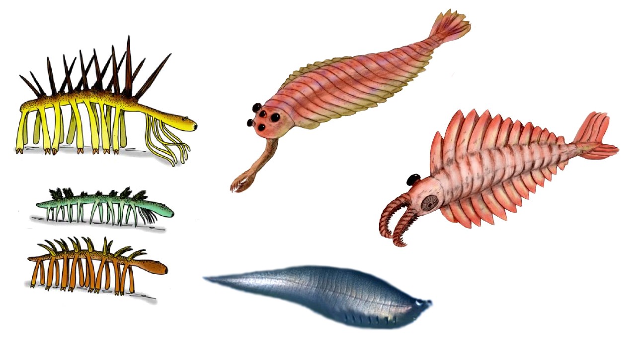 怪誕蟲(左)、歐巴賓海蠍(中上)、奇蝦(右)以及後斯普里格蟲(中下)的模樣。/來源:wiki