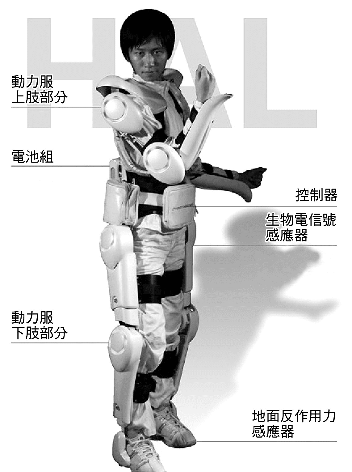 日本Cyberdyne公司的創立者——筑波大學(University of Tsukuba)山海嘉之(Yoshiyuki Sankai)教授,花費二十多年所研發的外骨骼動力服H A L (H y b r i d Assistive Limb),目前已經進入第五代,當初它的設計主要是針對照顧病患的看護及醫院護理人員,增進他們的力量,以減輕照顧病人的負擔;另一方面,就是希望針對行動困難的人提供幫助。因此HAL 主要被用來輔助日常活動,如從椅子上站起、行走、上下樓梯以及抬重物等動作。在未來,希望HAL 可以支援工廠內較吃重的工作,或是在災難現場協助救援工作的進行。