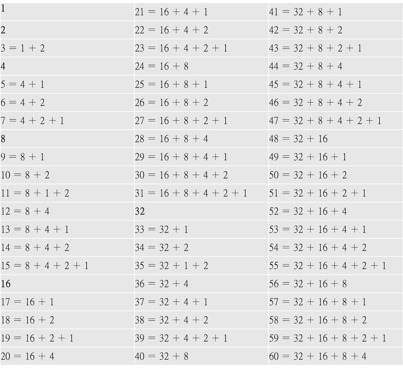 3.此數學魔法術所涉及的數學原理,其實是數學二進位的數字規則運用。數字規則如表一所示,了解此數字規則後,以共同擁有的數字排列組合,設計出六張5× 6(如上述道具數字卡)的卡片,便可透過各數字卡有或沒有(二進位規則)來知道其心中所想的數字。