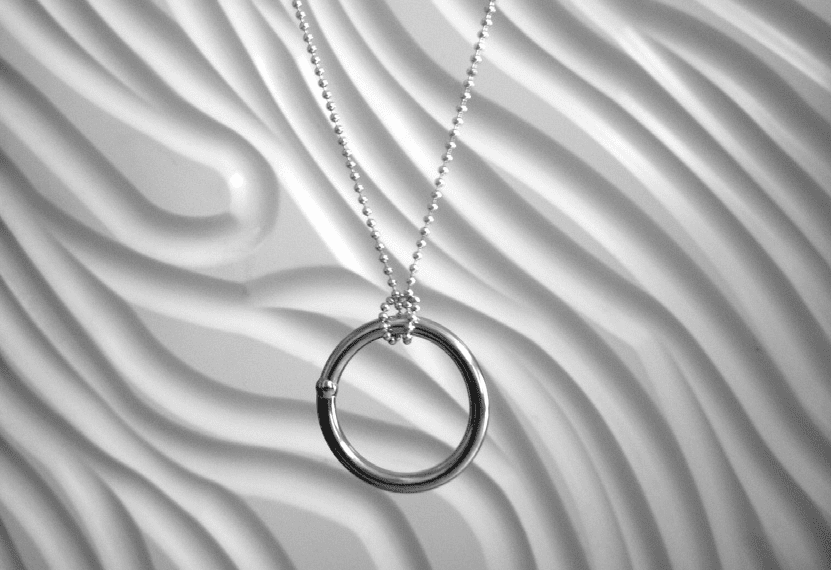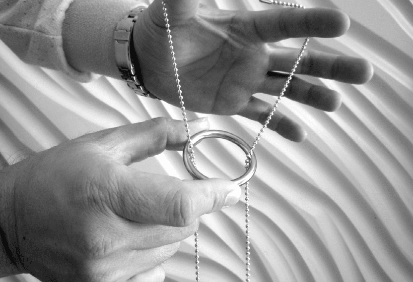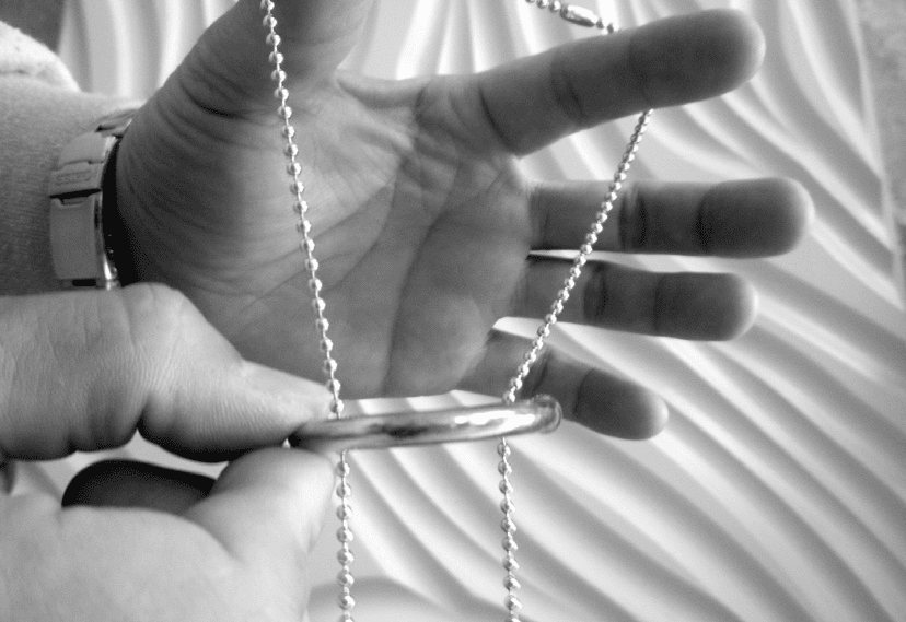 圖一:將鐵環由下向上穿過珠鍊至手掌下方。