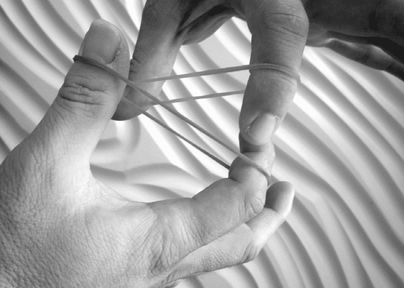 動時,人眼所看到的影像消失後,人眼仍能繼續保留其約0.1~0.4 秒左右的圖像影像。人眼在觀看物體時,成像於視網膜上,並由視神經輸入人腦便能感覺到物體的像,但當物體移去時,視神經對物體的印象是不會立即消失,而是會有持續0.1~0.4 秒的時間;魔術師的很多手法便是運用人眼的這種被稱為「眼睛的視覺暫留」特性,來達到欺騙觀賞者大腦與眼睛並達到視覺錯覺的現象之魔術效果。因此如果手法不夠快或太慢,就會看出此魔術的秘密,當然橡皮筋本身彈性與彈力的運用,也是搭配此演出的重要關鍵之一。