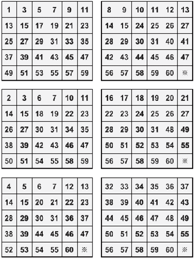 2.呈現手法:表演者先請觀眾心中決定一個介於1~60 的數字,或是請其將之寫入一張紙片中,並折疊收好。隨後,表演者取出先預備好的數字卡,一一請觀眾檢視其心中所決定的數字有無出現於卡片中。在觀眾檢視完畢後,表演者便可馬上說出觀眾心中所想的數字,完成此讀心術的表演。