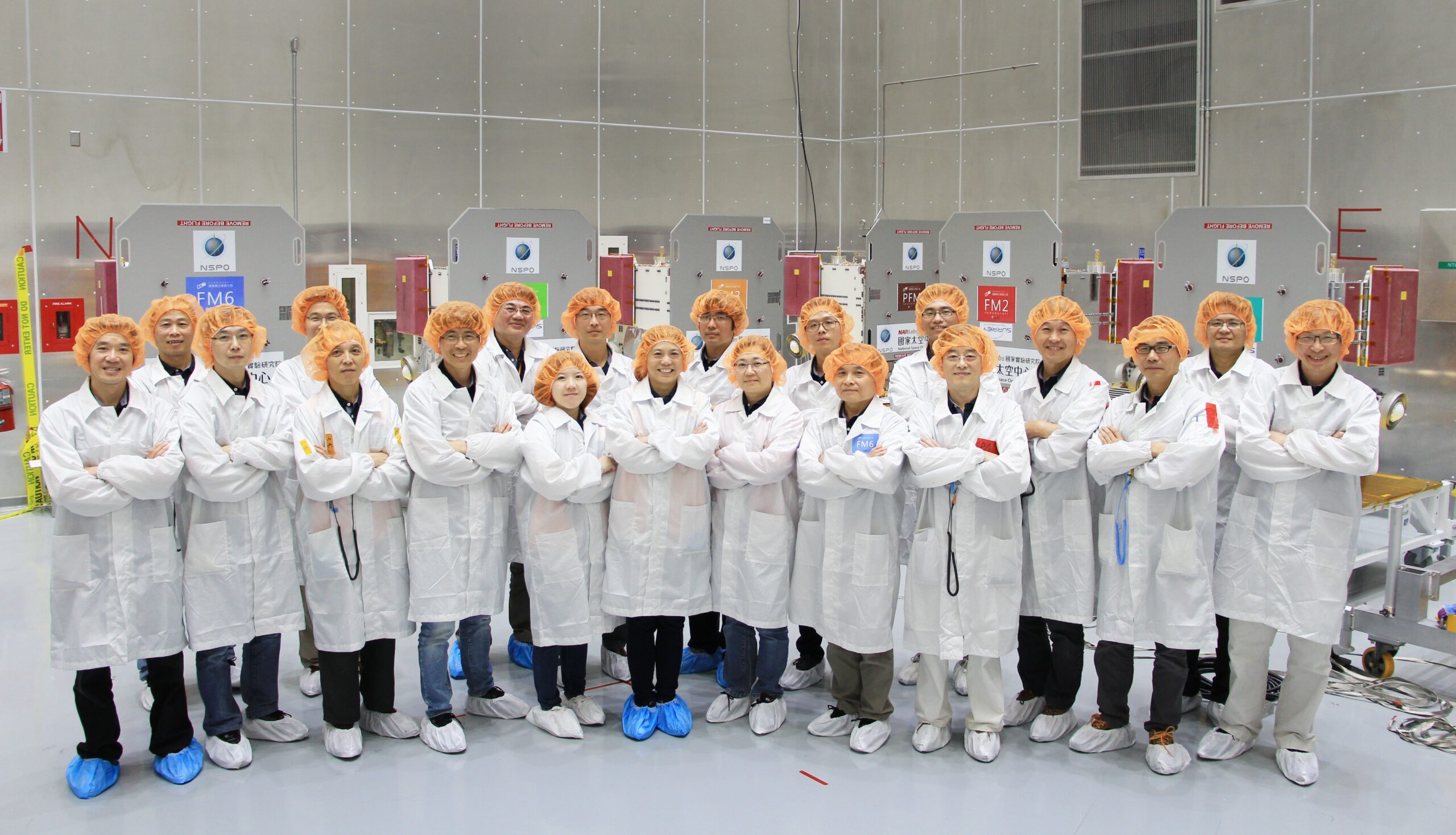 福衛七號在美國佛州卡納維爾角發射場作業人員合照,後面為已經在發射場完成發射前衛星作業準備,整裝待發的六枚衛星。