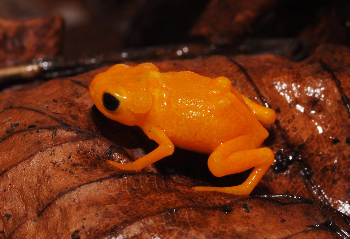 而牠的俗名則是「Pumpkin toadlets」(直翻就是南瓜蟾蜍),顧名思義,牠的體色跟南瓜一樣,全身都是橘黃的喔!而且虹膜也是黑色的,看起來就像裝了一對假的圓滾滾黑色大眼睛,很可愛的樣子。