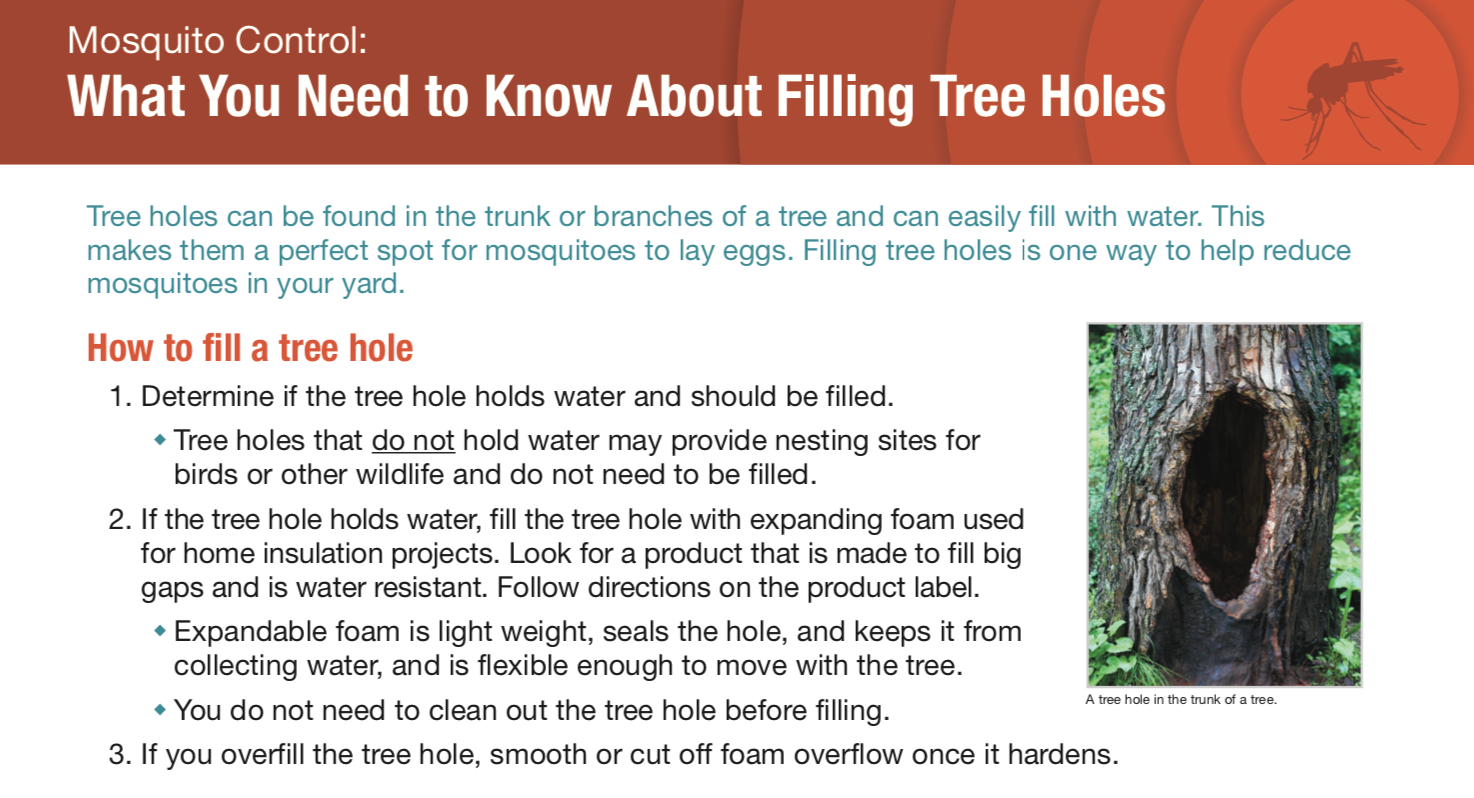 美國疾病管制署在 「Mosquito Control:What You Need to Know About Filling Tree Holes 」一文中更明確規劃了防治病媒蚊填充樹洞的指引5: