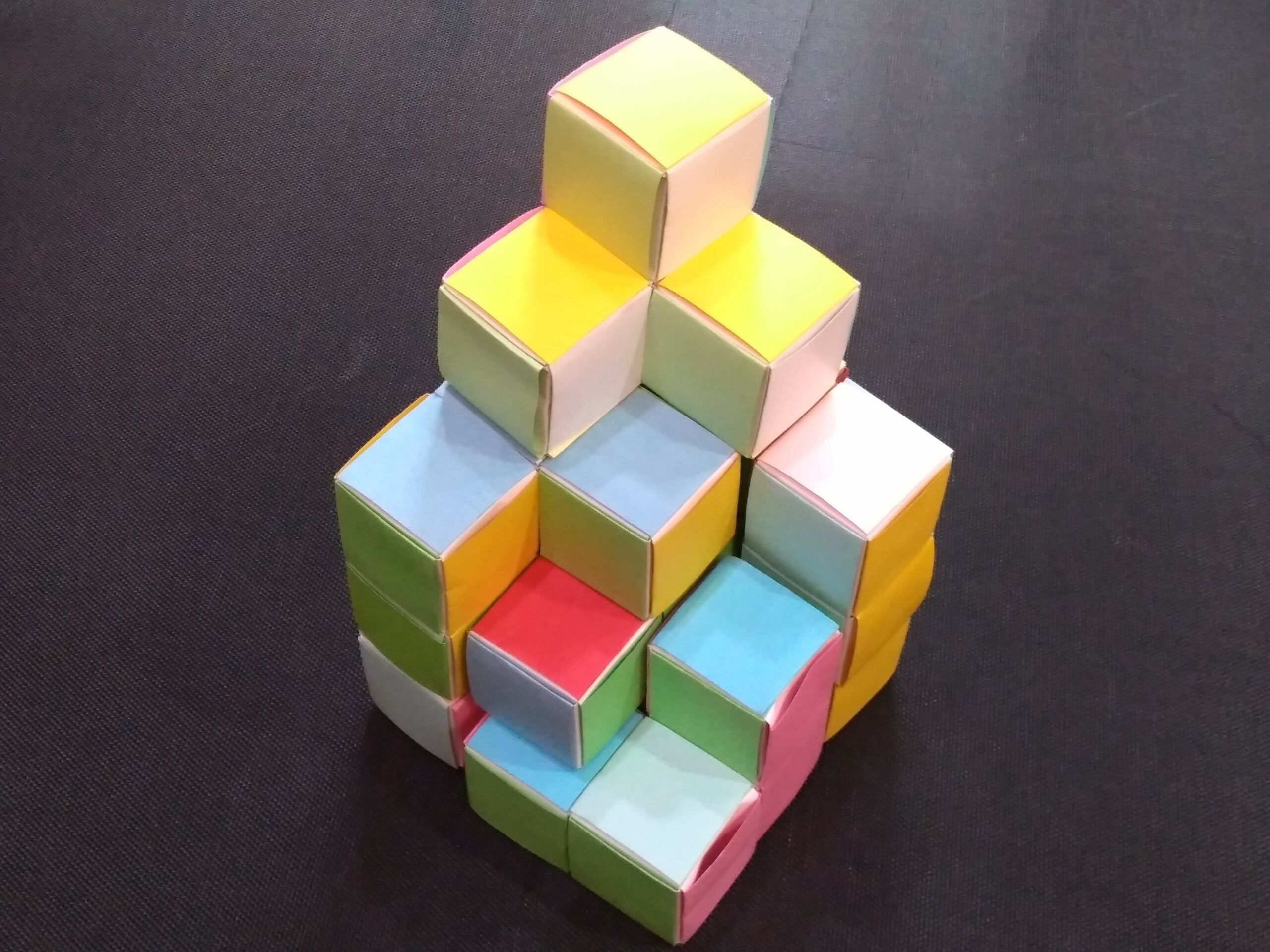 在扣接時,可以讓上下兩面、左右兩側與前後兩側使用同一種顏色的名片紙,就正式完成這個三連方了(如圖 18)。你會發現成品加了外側名片紙後,明顯要比之前穩固許多。