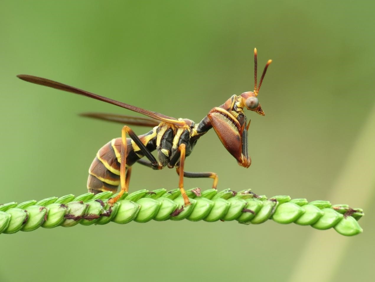 這種除了裝得像蜂一樣,還在前腳特化成鐮刀狀的捕捉足,變得像螳螂又像虎頭蜂的融合體,但牠兩者都不是,而是脈翅目的成員:螳蛉 (Climaciella brunnea)。