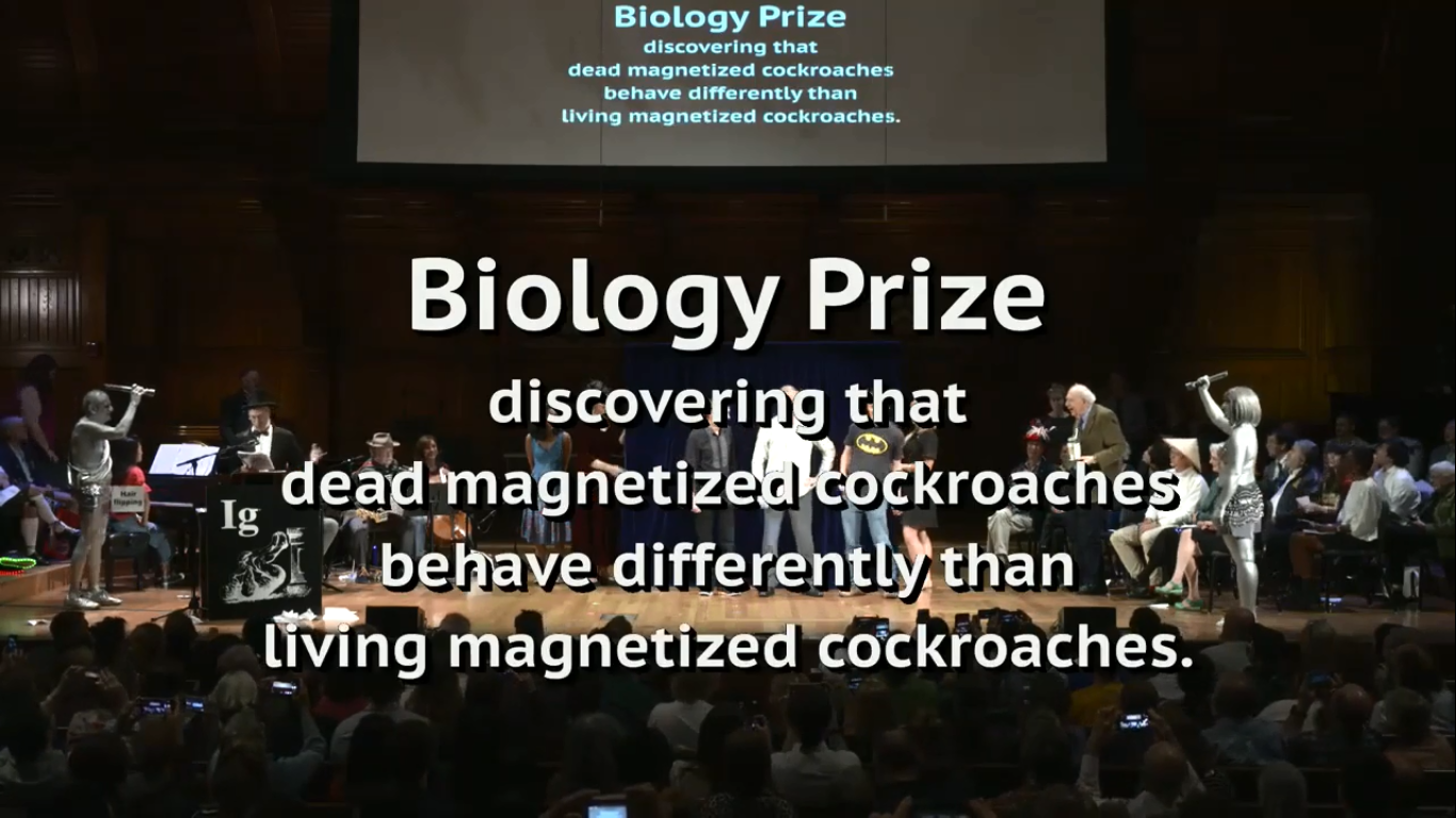 領獎演說:「我們發現了:死掉的蟑螂比活蟑螂能夠維持磁化狀態更久,各位請看!!!」