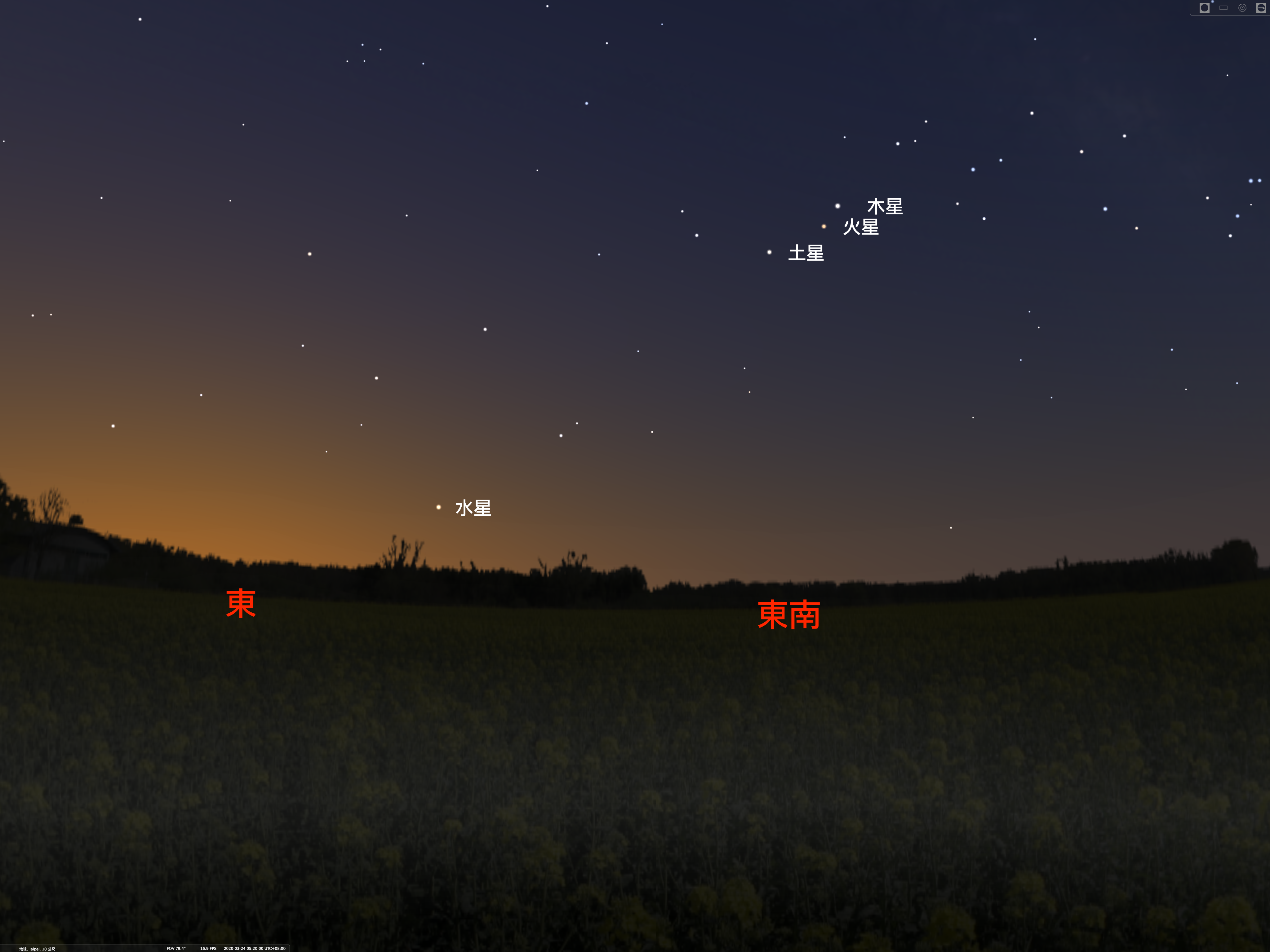 水星平時相當不容易看見,水星西大距是日出前最容易看見水星的好時機。3 月 24 日是水星西大距,當天的清晨有機會同時看見水星、土星、火星和木星出現在東南方!