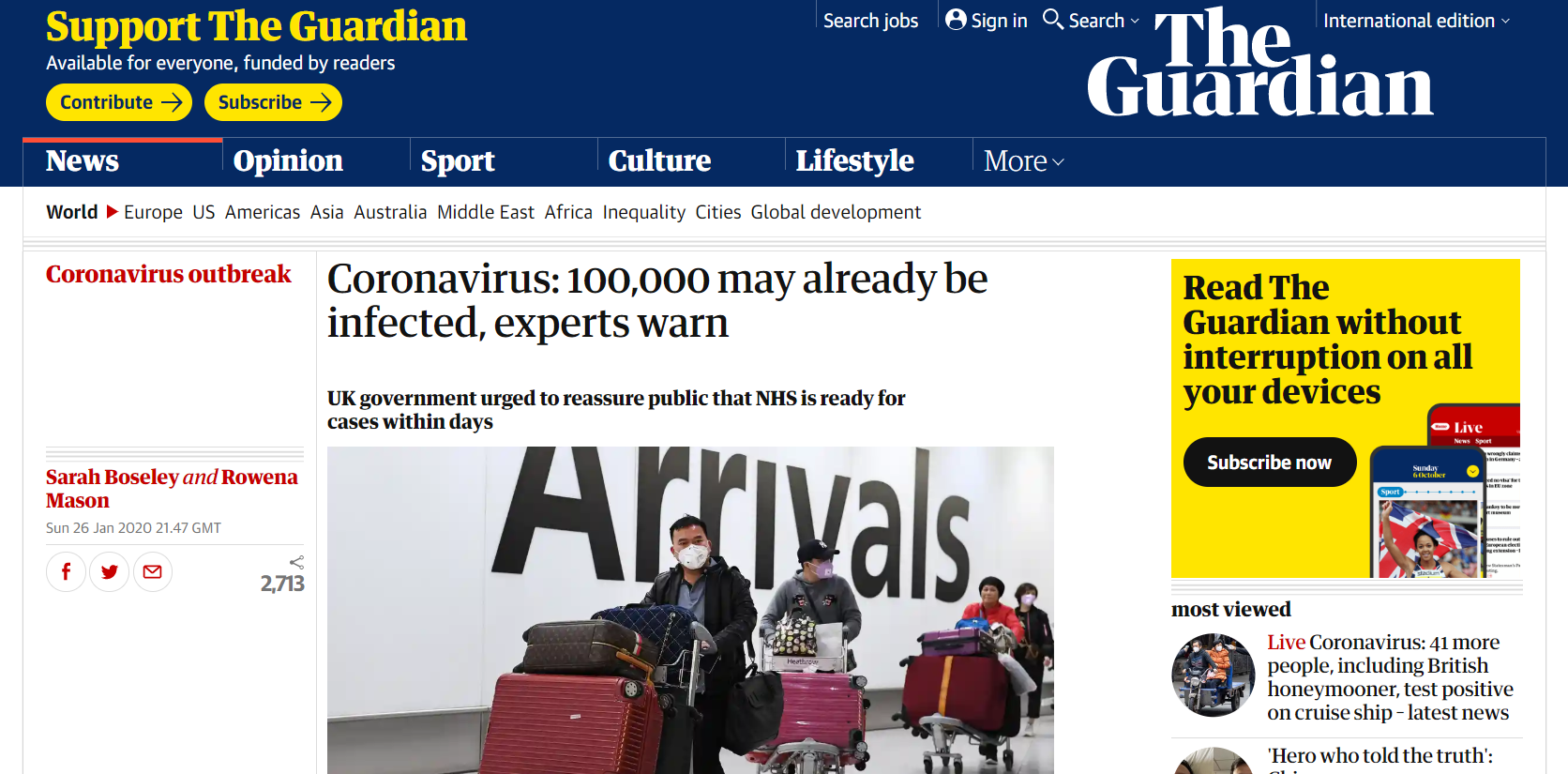 來自英國《衛報》(The Guardian) 的報導,一位倫敦帝國學院 (Imperial College London) 的公共衛生專家 Neil Ferguson 警告,他的「最佳猜測」是中國已有 10 萬例新型冠狀病毒確診患者。另一個在 YouTube 的一段影片,推測由武漢一名護士所拍攝,有近 80 萬人次觀看,其聲稱中國確診新型冠狀病毒的患者超過 9 萬人。
