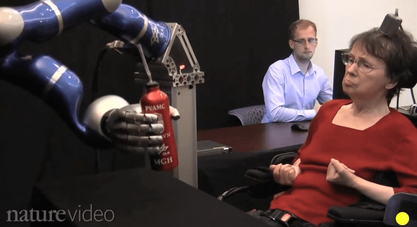 Cathy Hutchinson已經四肢癱瘓了十五年,但是現在他可以透過人機介面,用大腦控制機械手臂伸向並拿起杯子,啜飲一口晨間咖啡。這個人機介面在Cathy 頭上植入了96-channel每根只有頭髮這麼粗的微電極,讀取一小群運動皮質的神經元活動情形,透過電腦運算把這些訊號轉換,變成數位命令給機械手臂。