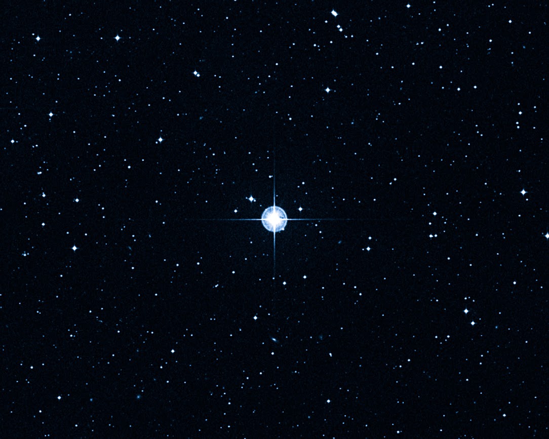 This is a Digitized Sky Survey image of the oldest star with a well-determined age in our galaxy. The ageing star, catalogued as HD 140283, lies over 190 light-years away. The NASA/ESA Hubble Space Telescope was used to narrow the measurement uncertainty on the star's distance, and this helped to refine the calculation of a more precise age of 14.5 billion years (plus or minus 800 million years). The star is rapidly passing through our local stellar neighborhood. The star's orbit carries it through the plane of our galaxy from the galactic halo that has a population of ancient stars. The Anglo-Australian Observatory (AAO) UK Schmidt telescope photographed the star in bluelight.