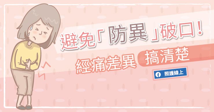 陳怡仁理事長認為婦女應了解自己的經痛類型。原發性經痛指的是無明確的病理性疾病造成經痛,通常發生在月經來的期間,可能會有腹部痙攣和下腹疼痛,通常是月經來潮的第一、二天且疼痛感較輕微。而續發性經痛則可能是因骨盆腔發炎、子宮內膜異位症、子宮肌腺症或子宮肌瘤等疾病造成,大部分患者會於月經來之前就會感到疼痛,甚至經期結束還會繼續疼痛。