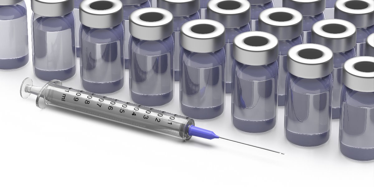 Vaccination, health care concept. Medical injection syringe and vaccine vials on blue background. Syringe and vials, liquid medicine. 3d illustration